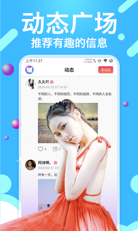 4.【动态聊天】有趣的人在你一次刷新你,你和ta从未如此靠近,互动聊天,线下奔现,线上线下一起嗨,线下约见让你交友更轻松。