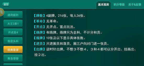 名次:游戏中,第一个出完牌的玩家为一游,其次为二游三游,最后剩下的玩家为末游。 游戏结束后,末游玩家所得到的分数归一游玩家所有,手中未出的分数归三游所有。